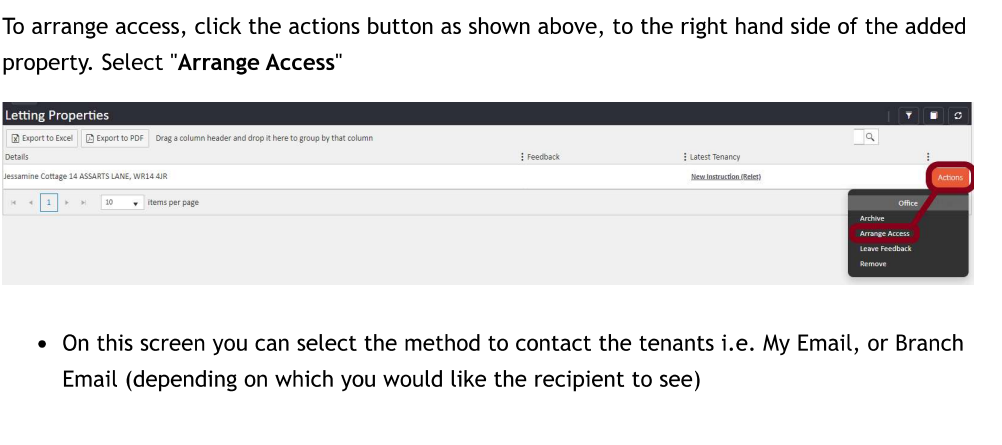 To arrange property access in AgentOS, book a diary appointment, link the relevant property to it, then use the "Arrange Access" option to notify the tenants by email or letter.