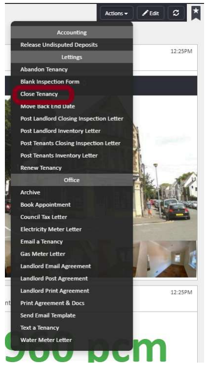 - Click the Actions button and scroll down to the Lettings section of the menu.