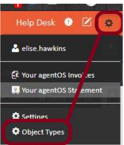 Click the person icon in the top right corner of agentOS to open the Control Panel, then select Object Types from the menu.