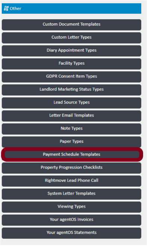 If the standard rent schedule options in agentOS do not cover the periods you need, you can create a custom payment schedule template. Once saved, the template can be applied to any tenancy without having to set up the schedule manually each time.
