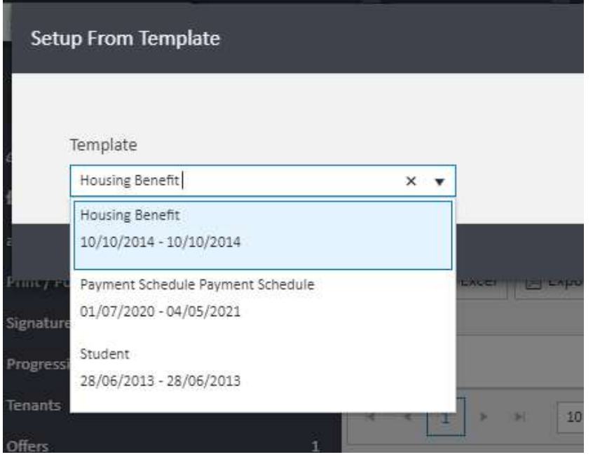 A panel will open showing a list of your saved templates. Select the correct one from the dropdown — options will include all previously created templates such as Housing Benefit, Payment Schedule, and Student.