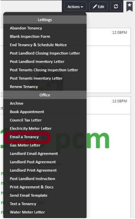 Click the Actions button in the top right corner of the tenancy profile. From the dropdown menu, scroll to the Office section and select Email a Tenancy.