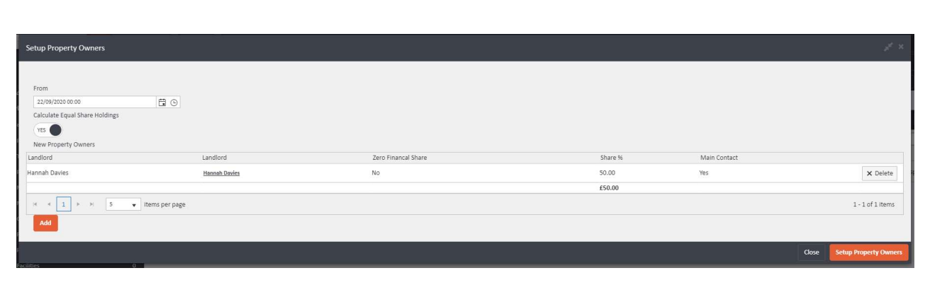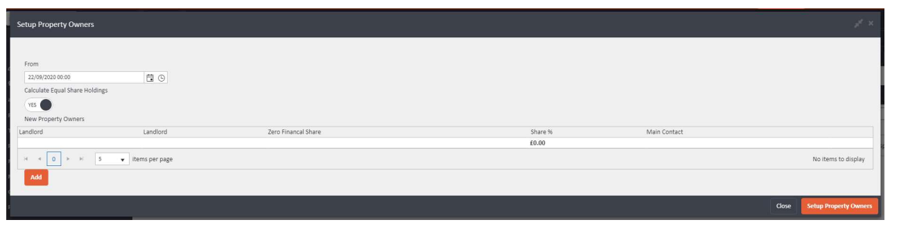 This will open the Setup Property Owners panel, which contains a grid for adding landlords and fields including From date, Calculate Equal Share Holdings toggle, and a list of New Property Owners.