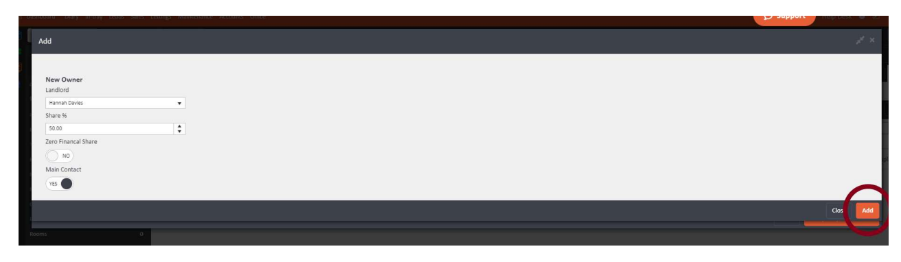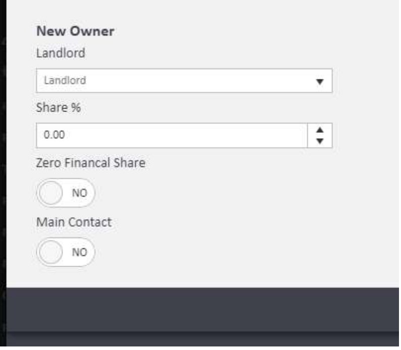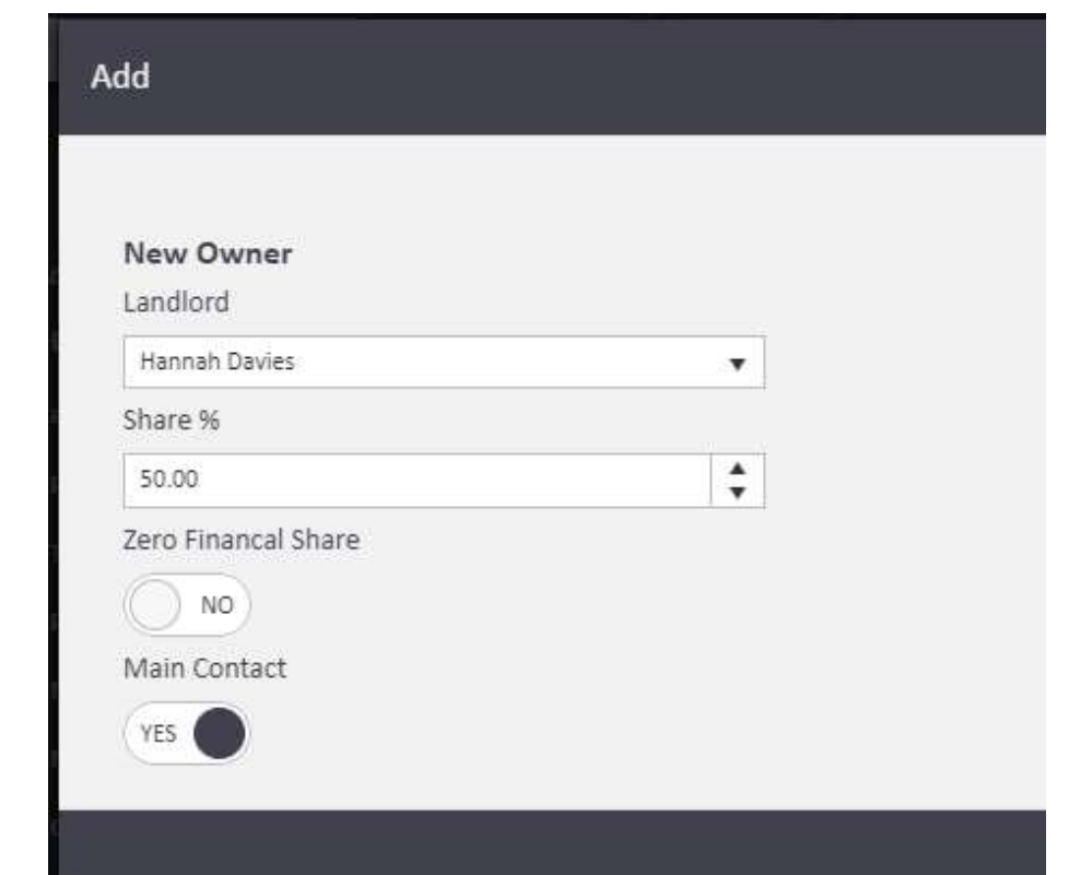 Zero Financial Share: If a landlord has no financial entitlement to the rent but still needs to be linked to the property (for example, as a named contact), toggle Zero Financial Share to Yes. A landlord with a zero financial share can still be set as the Main Contact.