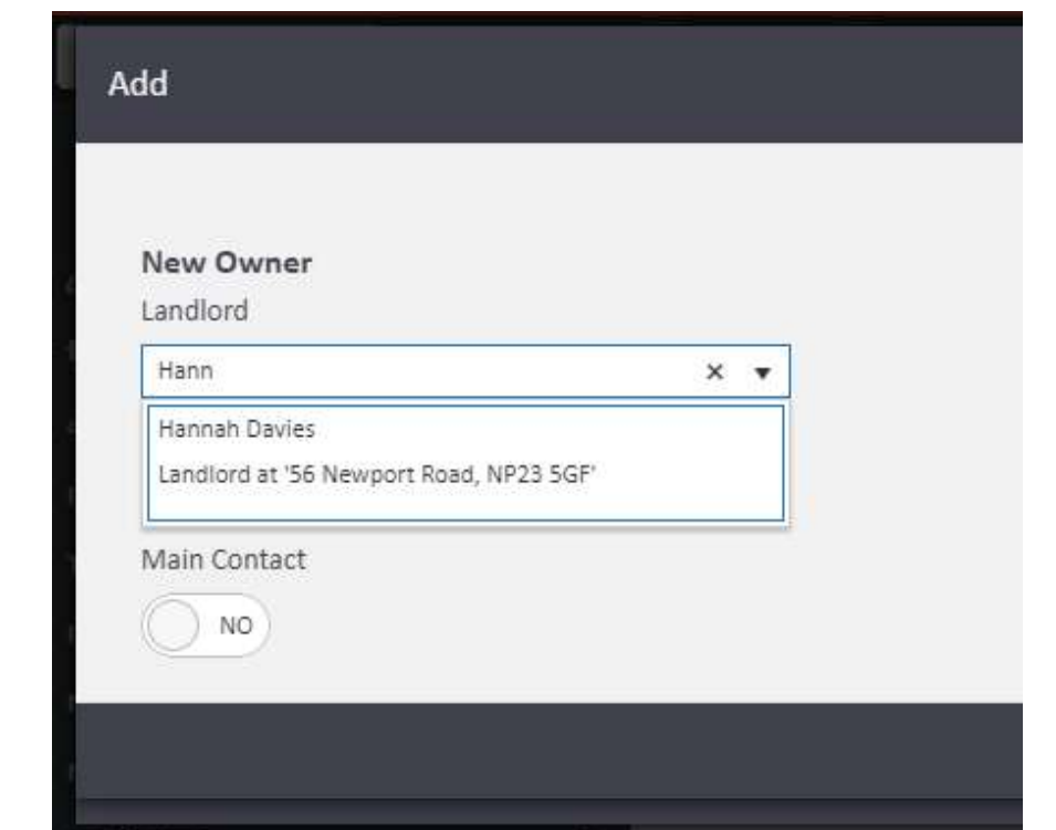 Type the landlord's name into the Landlord field. agentOS will display matching profiles from the system. Click the correct profile to select it.