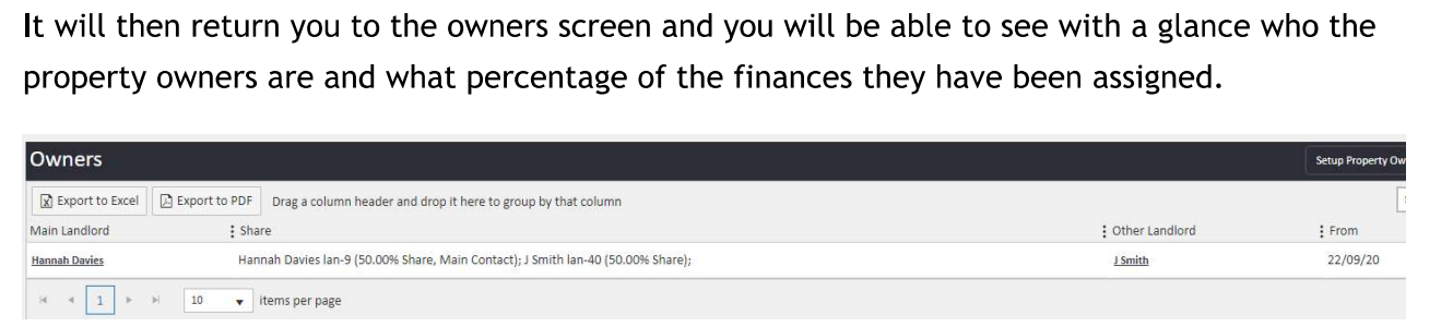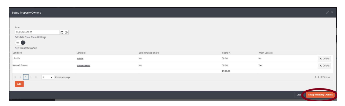 Once you are satisfied with all the owners and their share allocations, click Setup Property Owners in the bottom right-hand corner of the panel to save your changes.