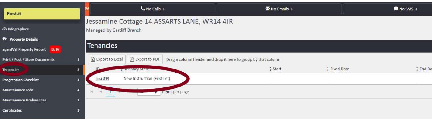 Click on the property to open it. On the left-hand navigation ladder, click Tenancies. The tenancy instructions linked to the property will appear in the centre panel. Click on the instruction you want to mark as Let Agreed.