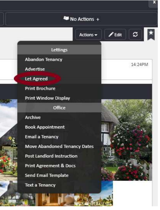 With the instruction open, click the Actions button in the top right-hand corner and select Let Agreed from the Lettings section of the dropdown menu.