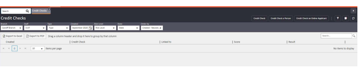 To view all previously conducted credit checks, hover over the left-hand side of the screen and select Credit Checks. You can also access this section through the Office menu in the main navigation bar.