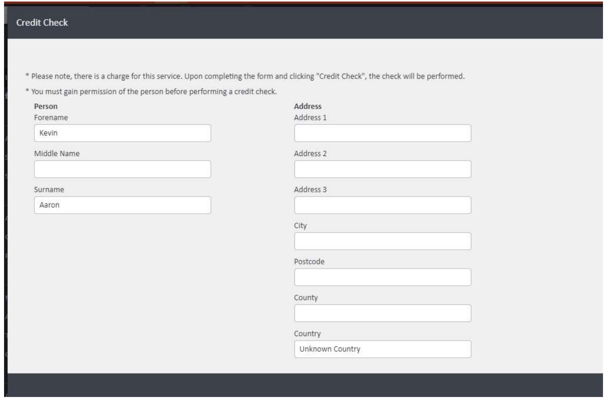 Clicking Check Now! will open a credit check form with the person's details pre-populated from their profile.