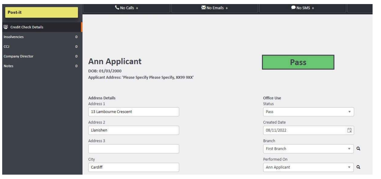 To perform a credit check in agentOS, click Check Now! on the Credit Check widget within the applicant or tenant record. Historic checks can be viewed via the left-hand ladder or through Office > Credit Checks. Results are returned as Pass, Caution, Fail, or No Results Found.