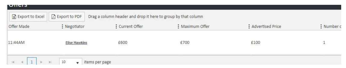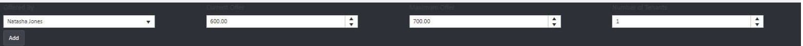 Once saved, the offer appears in the Offers grid below the Add form. The grid shows the Offer Made time, Negotiator, Current Offer, Maximum Offer, Advertised Price, and Number of Tenants.