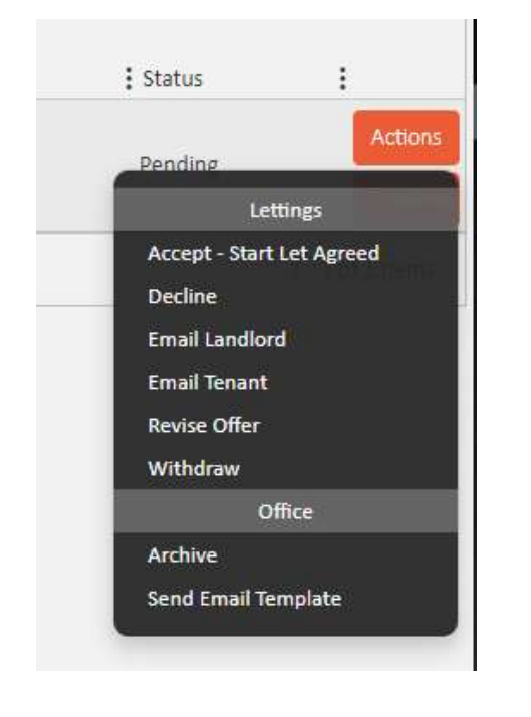 To action an offer, click the Actions button on the relevant row. The dropdown shows the following options under the Lettings section: