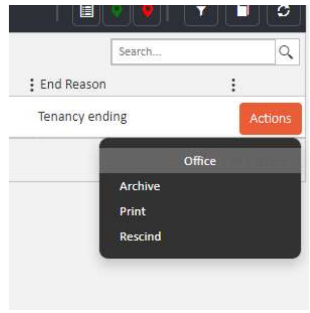 Find the issued notice in the list. Click the orange Actions button on the right-hand side of the notice row. A dropdown menu will appear with the following options under the Office heading: Archive, Print, and Rescind.