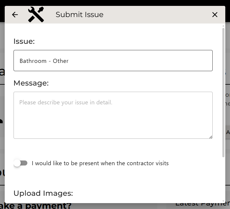 However, if photo documentation is essential for your maintenance workflow, this capability is available through Fixflo integration (see below), where photo uploads form part of Fixflo's guided repair reporting process.